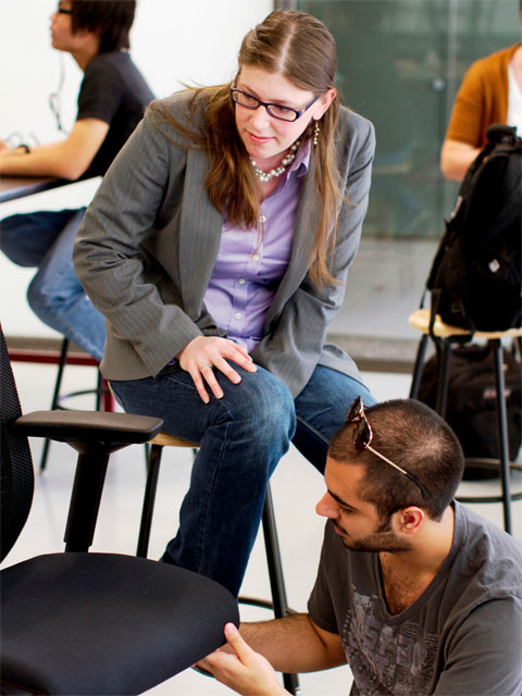 Amy Landis watches as a student deconstructs a chair in one of her classes. It’s one of the assignments Landis uses to teach students about sustainability. They learn about the sustainable aspects of the manufacturing process used to produce the chair, as well as its recyclability and re-use potential. Photo by: Jessica Slater/ASU