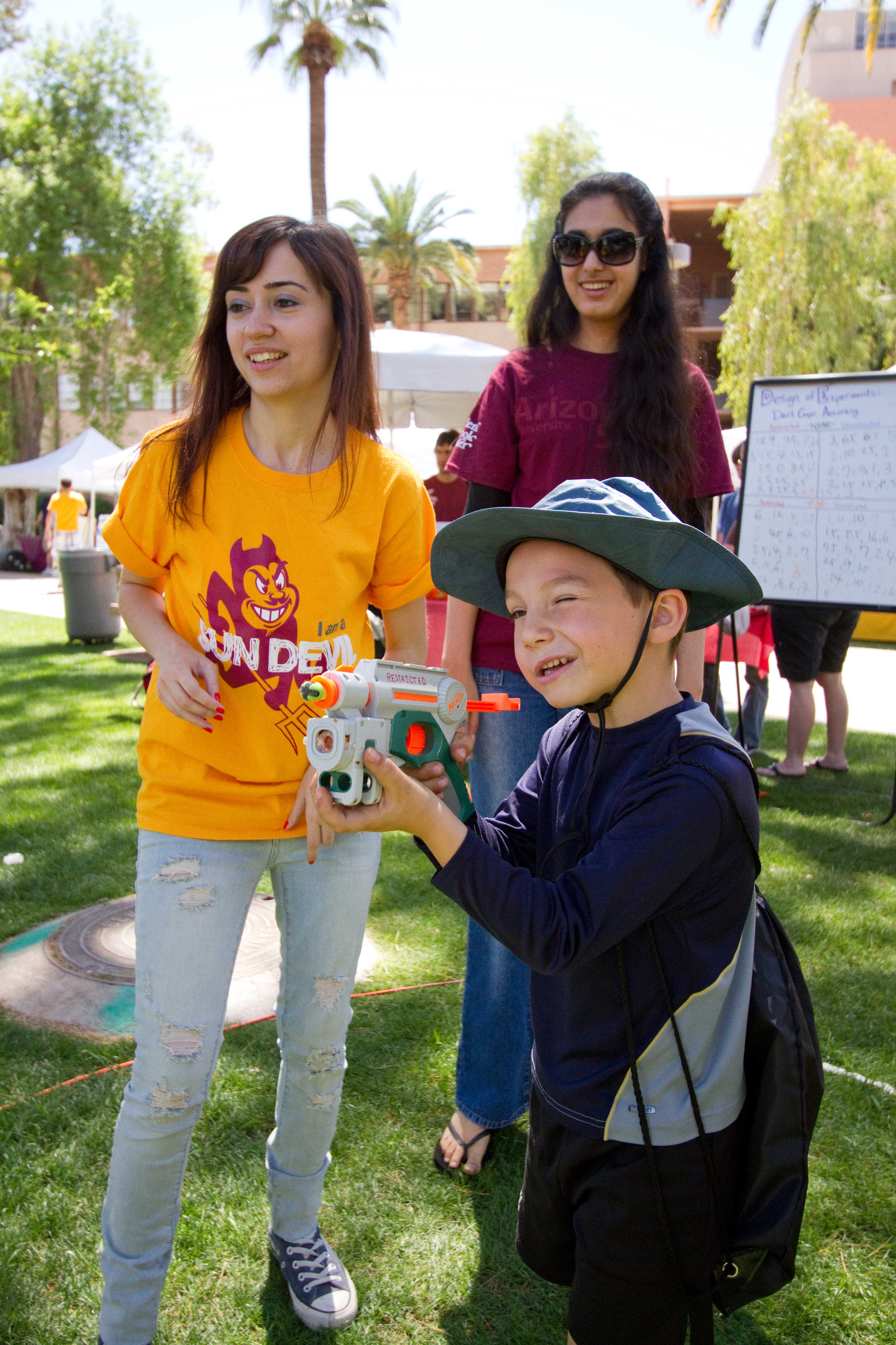 ASU industrial engineering doctoral students Petek Yontay (left) and Fariha Ejaz assist a young boy participating in the “Design of Experiments with Dart Guns” activity at the Engineering Open House. It was designed to teach basic methods of process optimization – in this case, the best method for shooting a soft-tipped dart so that it hits the bull’s-eye on a target. Photo by: Jessica Slater/ASU