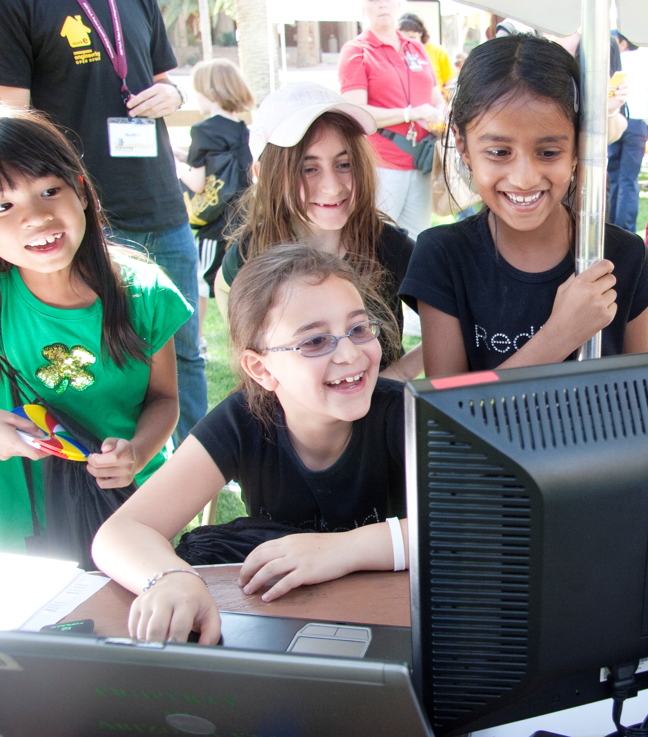 Young girls were entertained at the Engineering Open House by a computer video game created by ASU computer science and engineering students. The first-ever Engineering Open House presented by the ASU Ira A. Fulton Schools of Engineering enthralled youngsters from dozens of elementary and middle schools. Photo by: Jessica Slater/ASU