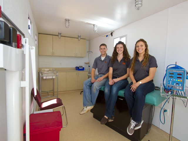 Members of G3Box are pictured in a mobile medical care facility they made from a steel shipping container. From left to right are Clay Tyler, Gabrielle Palermo and Susanna Young. (Not pictured is member Billy Walters.) Photo: Jessica Slater/ASU