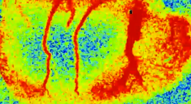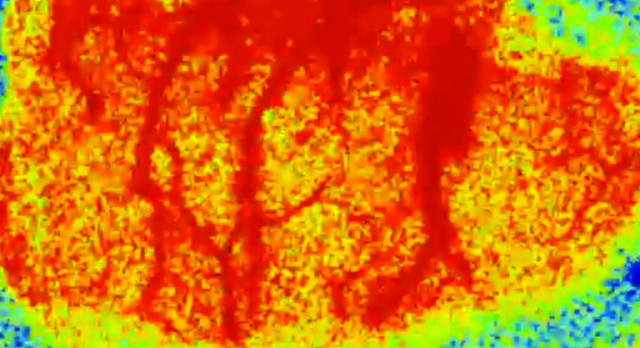 These images demonstrate change in blood flow in the brain before and after a stroke. The different colors indicate various levels of blood flow. Red indicates high blood flow, blue indicates low flow. The top image shows the result of stroke. The bottom image is a normal brain.
