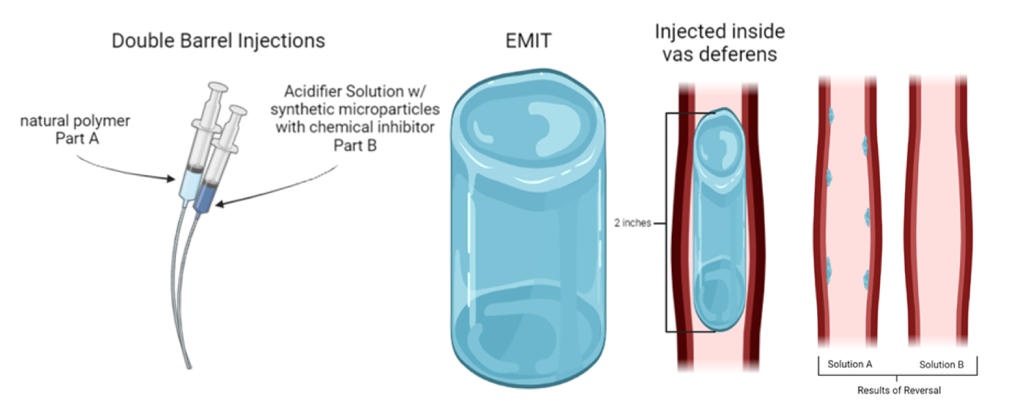 Together the group developed a concept called EMIT. It is a minimally invasive male contraceptive using an injectable hydrogel and chemical deactivator composite system that provides a completely reversible, double barrier to sperm movement through the vas deferens, which is the tube that carries sperm during ejaculation.