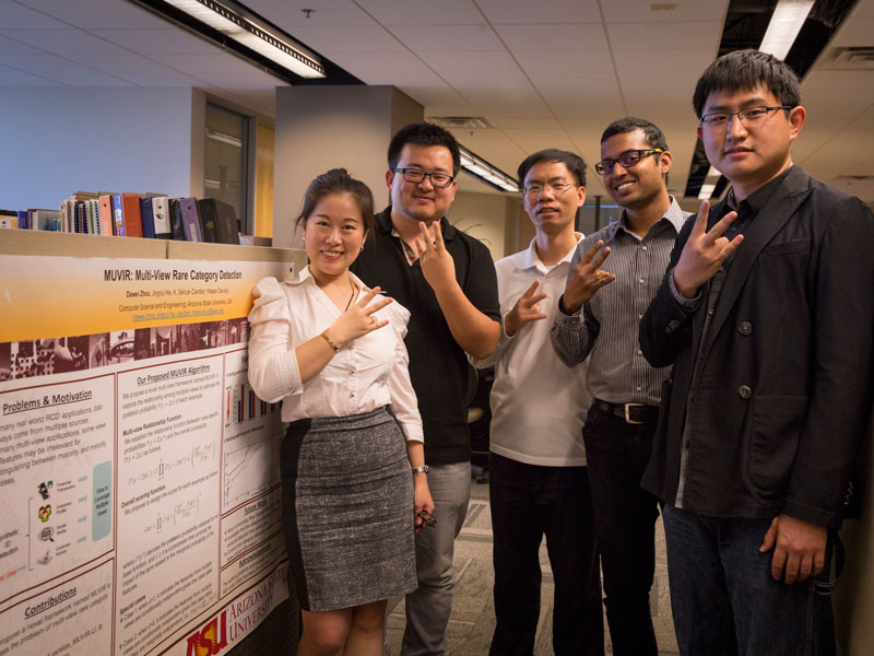 Jingrui He and graduate students (from left) Yao Zhou, Pei Yang, Arun Karthikeyan and Dawei Zhou are creating new theories and tools to analyze data heterogeneity. She helped create the Multi-View Rare Category Detection (MUVIR) algorithm to help find relevant data from irrelevant data originating from many sources. Photographer: Nick Narducci/ASU