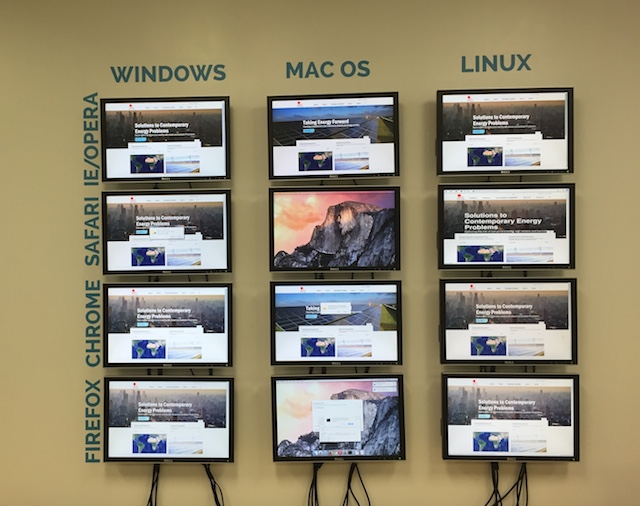 The lab features more than a dozen devices, including smart phones, tablets, laptops, computers, a smart TV and wearable technology from Apple, Android Kindle and Windows. One wall is lined with 12 computer monitors with Mac OS, Windows and Linux operating systems running Internet Explorer, Opera, Safari, Chrome and Firefox.