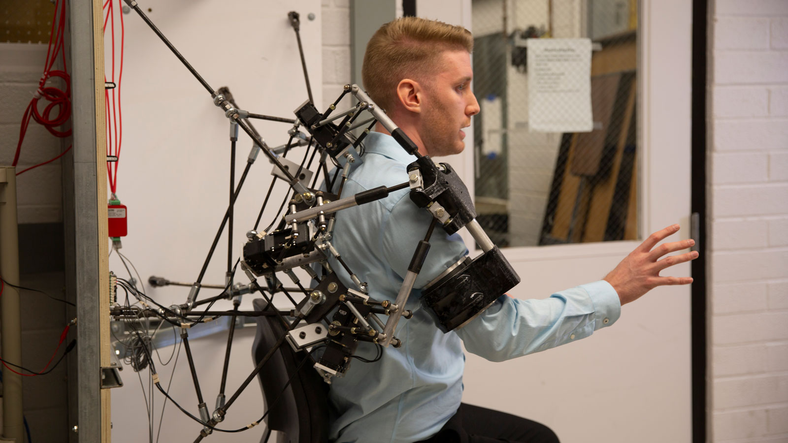 A student in Lee’s Neuromuscular Control and Human Robotics Laboratory demonstrates the Transparent Robotic-Aided Rehabilitation framework for exercise therapy. This robotics platform, developed with funding from a National Science Foundation Faculty Early Career Development Program (CAREER) Award, will improve the effectiveness of robot-aided rehabilitation for stroke survivors. Photographer: Erika Gronek/ASU